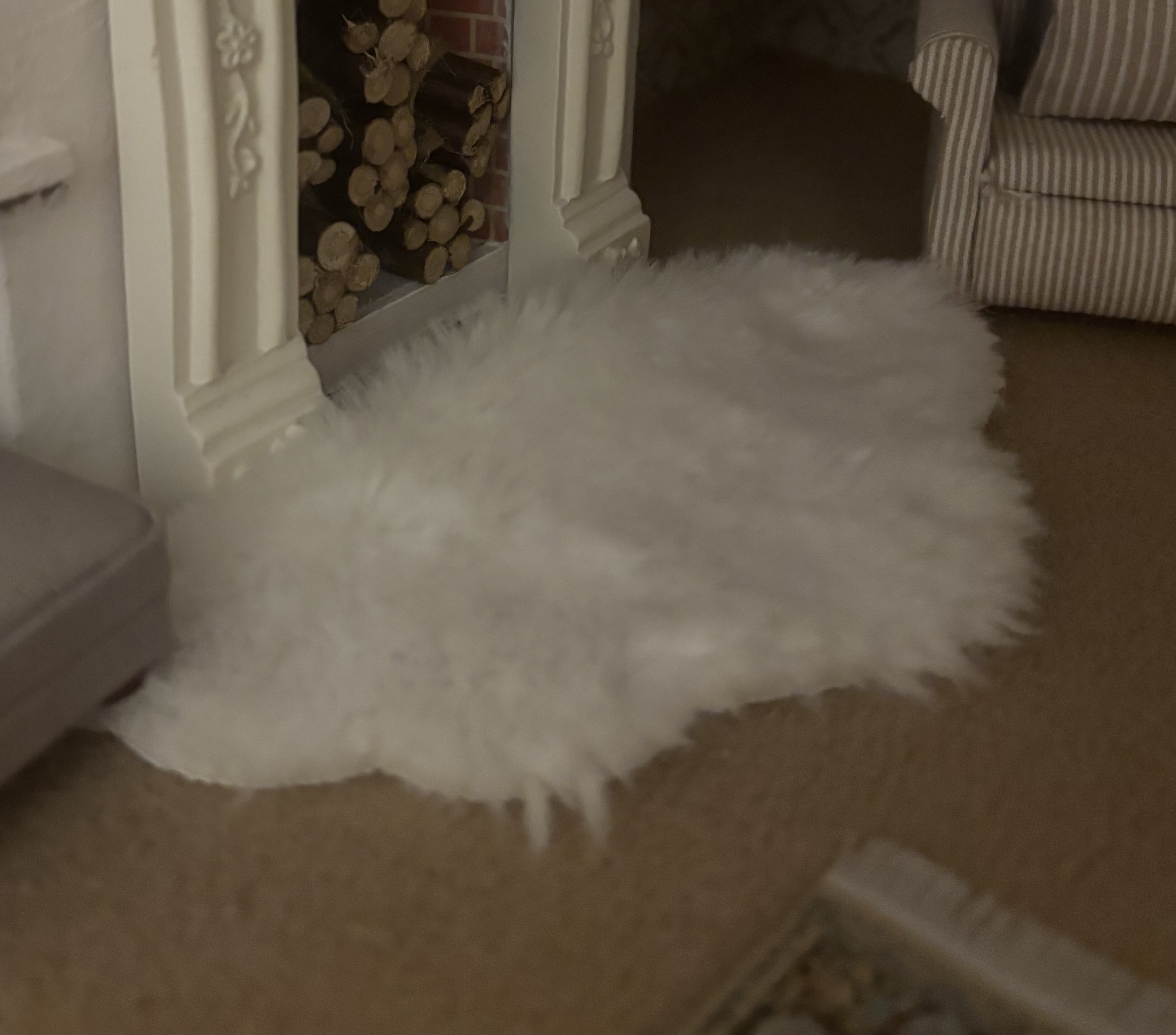 cosy white rug 1:12 ideal for by the fire or in bedroom. Try not to move around too much to avoid fibres shedding. (just trim off if any loose fluff)